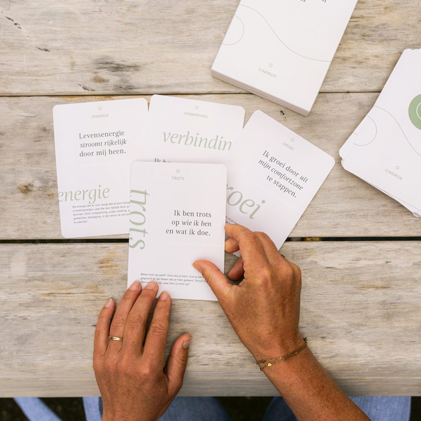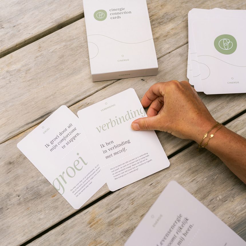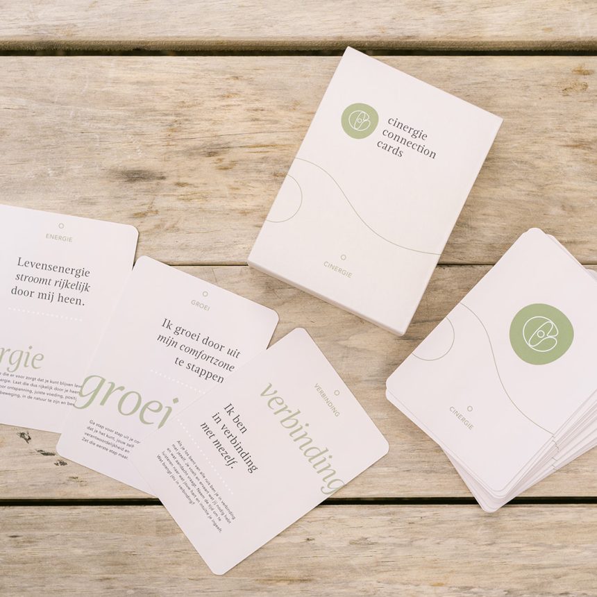 Het Cinergie Connection Cards deck bevat 39 kaarten met één woord als thema. De thema’s variëren van keuze en richting tot liefde en loslaten. Uiteindelijk gaat het allemaal om de verbinding met jezelf.