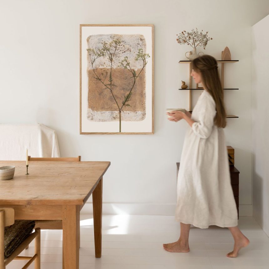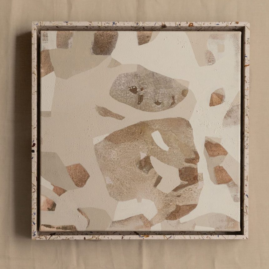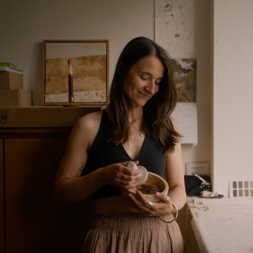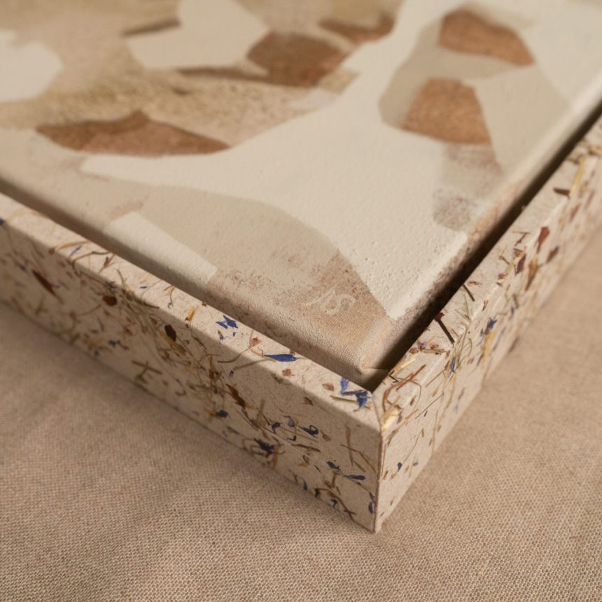 Met haar handverzamelde aardpigmenten creëert ze abstracte schilderijen die rust en verbondenheid met de natuur ademen. Elk werk vertelt het stille verhaal van een plek op aarde, en brengt een verfijnde, natuurlijke sfeer in je interieur.